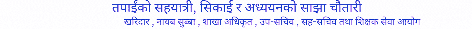 संघीय तथा प्रदेश लोक सेवा आयोग, शिक्षक सेवा आयोग लगायत अन्य प्रतिस्पर्धात्मक परिक्षा तयारी गर्दै हुनुहुन्छ ? निःशुल्क (Free) तथा सःशुल्क(Paid) तयारी अध्ययन सामग्रीका लागि Www.selfstudy.com.np भिजिट गर्नुहोस्।